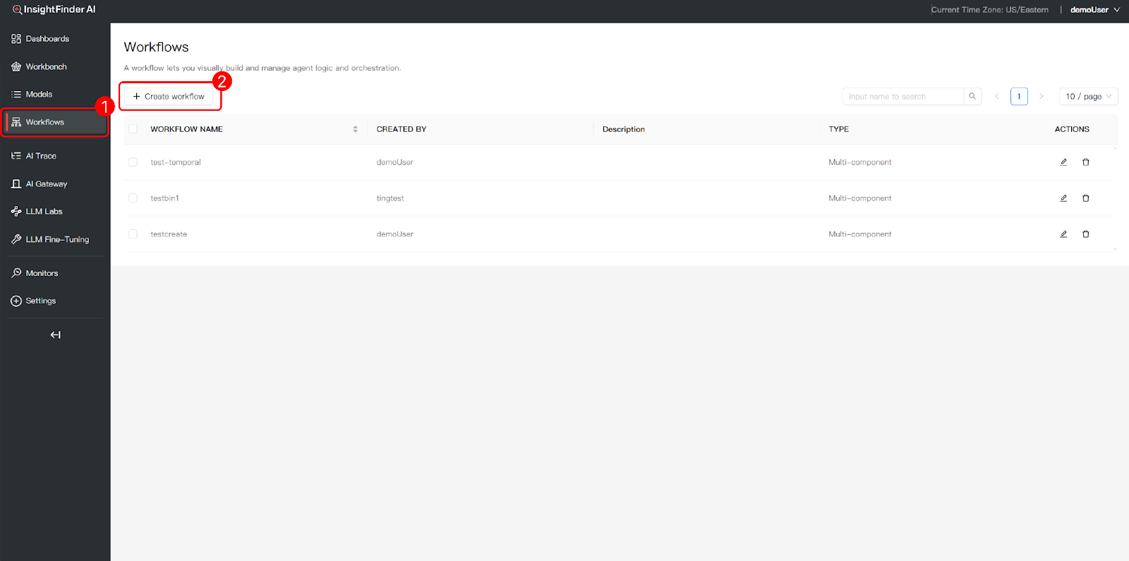 • Create a New Workflow: Click the “+ Create workflow” button to start building a new agent workflow from scratch.
