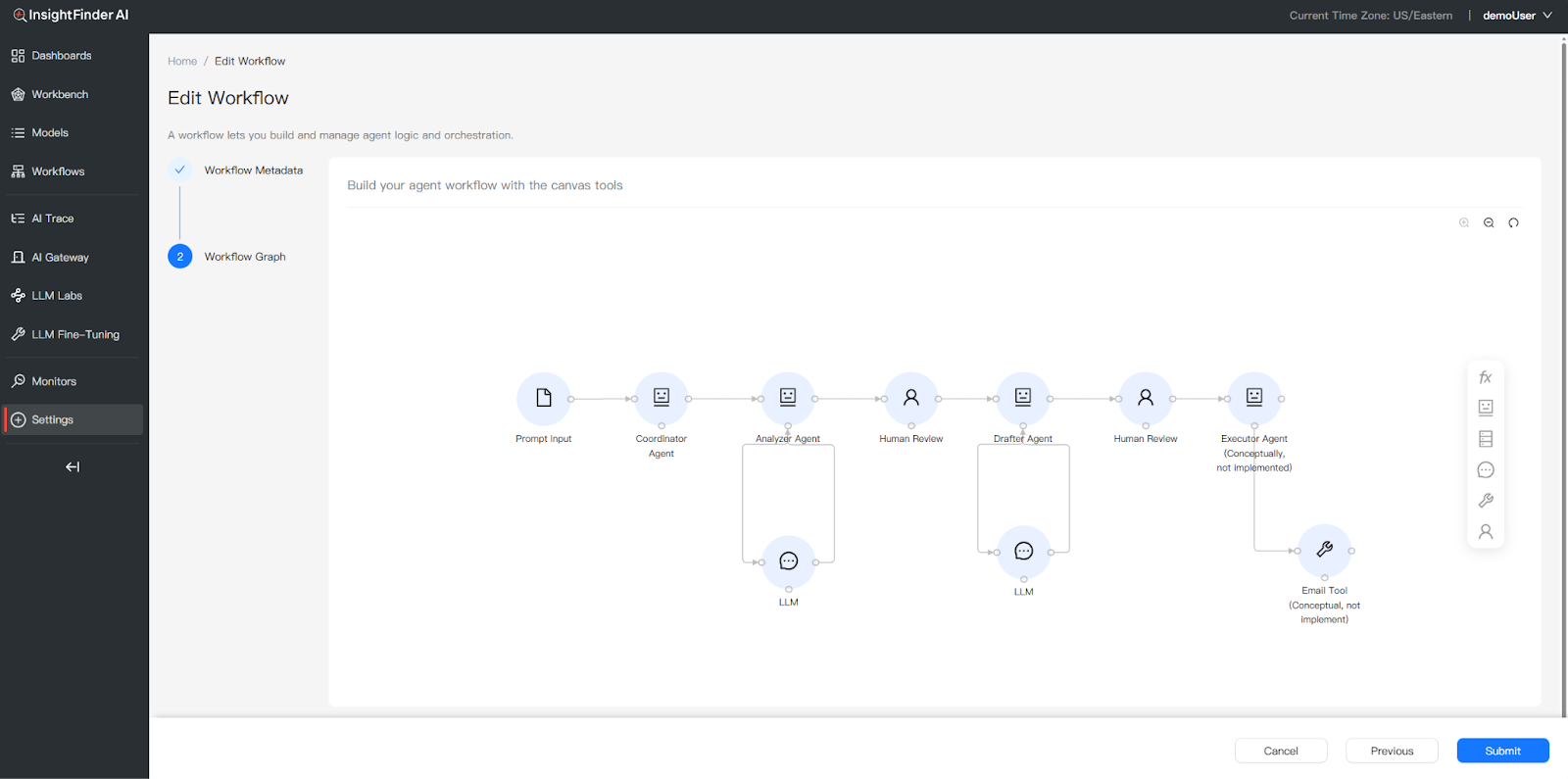 1 Design Your Workflow Use InsightFinder’s visual Workflow Canvas to define your agents, their roles, tools, and human review checkpoints. This gives InsightFinder context about your system’s intended architecture.