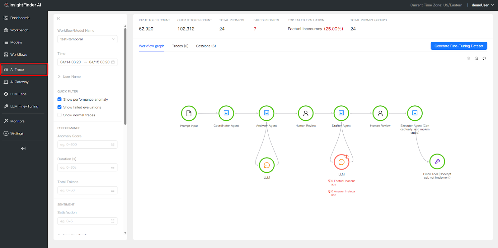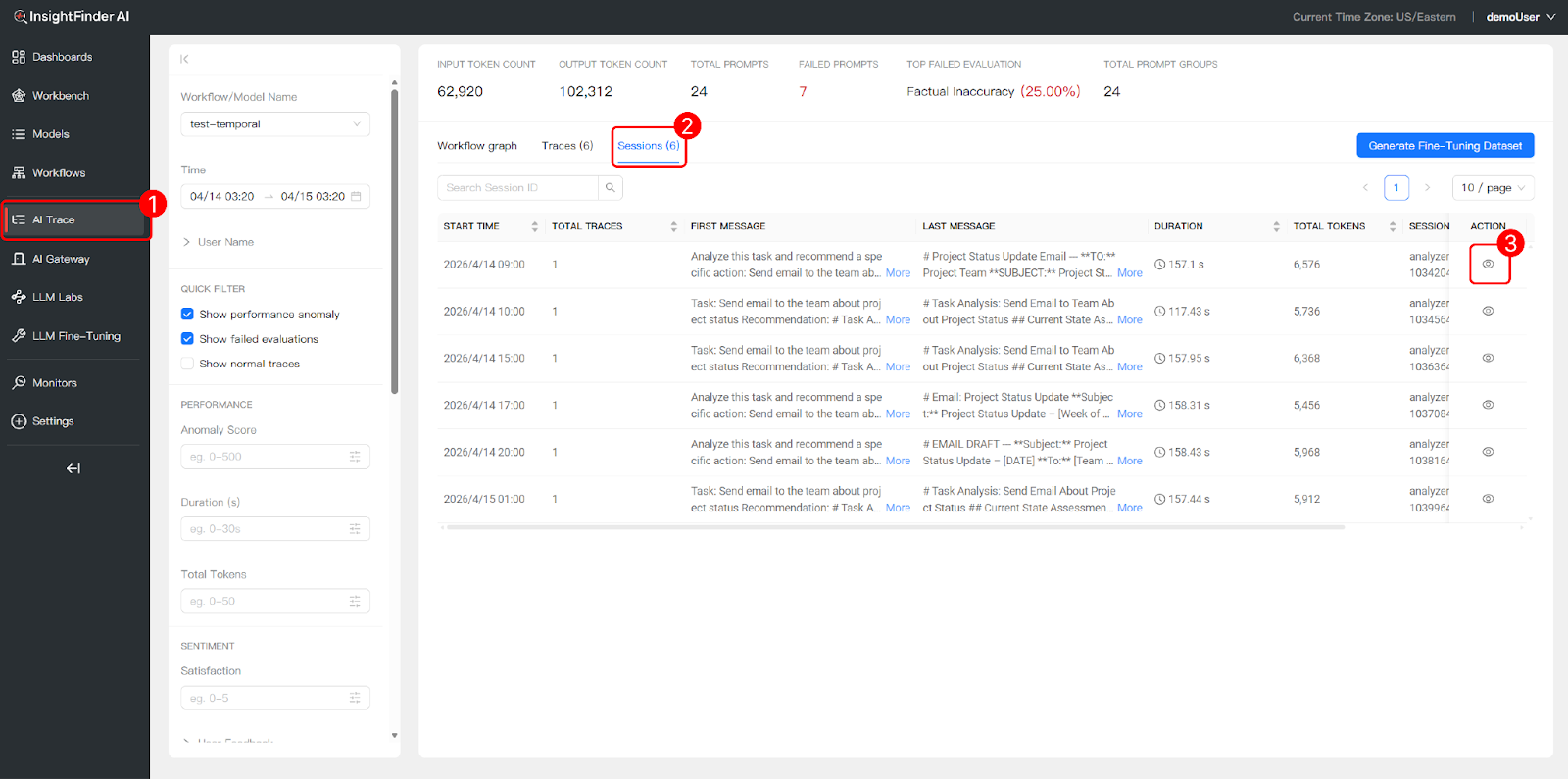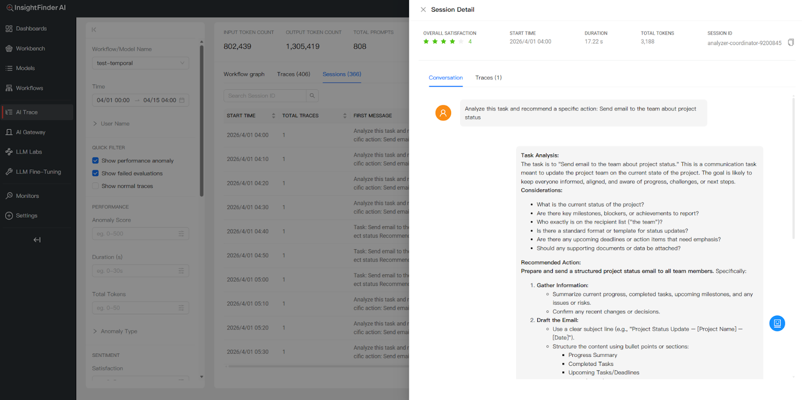 3 Monitor & Debug Use InsightFinder’s Trace View, Trace Records, and Session Logs to monitor workflow health, investigate anomalies, inspect individual LLM interactions, and analyze user sessions—all from a single dashboard.