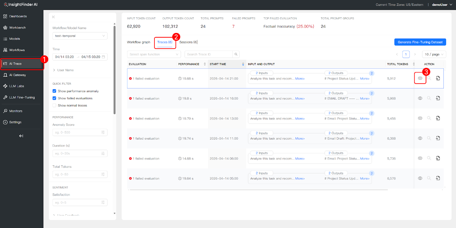 • Traces View: Lists the individual trace records that make up the session. Each trace shows its evaluation status, duration, token count, and whether any anomalies or failed evaluations were detected.