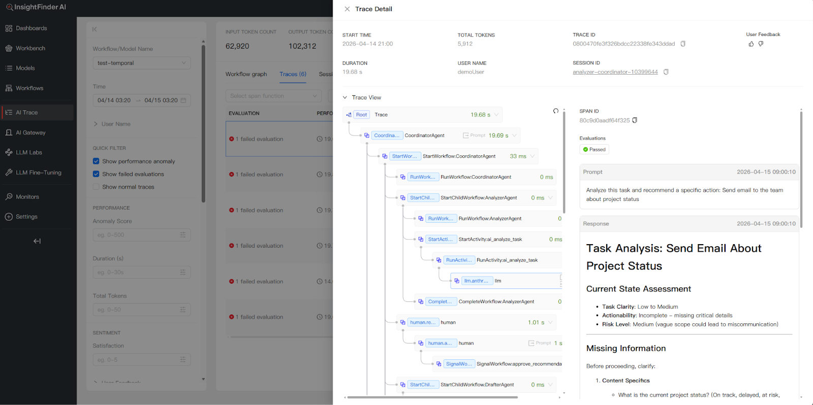 This workflow pattern demonstrates how InsightFinder traces capture every step: each agent’s LLM calls (with prompts, responses, and token counts), human approval signals, and tool execution—all linked under a single Trace ID for end-to-end observability.