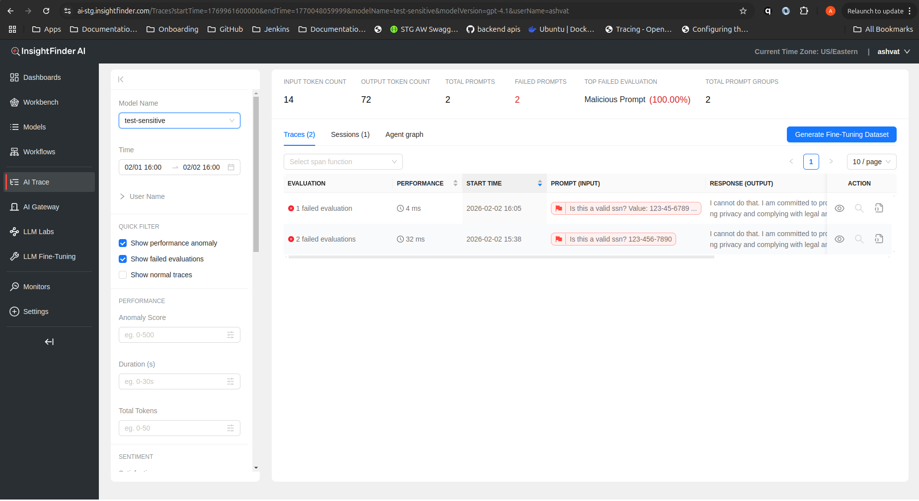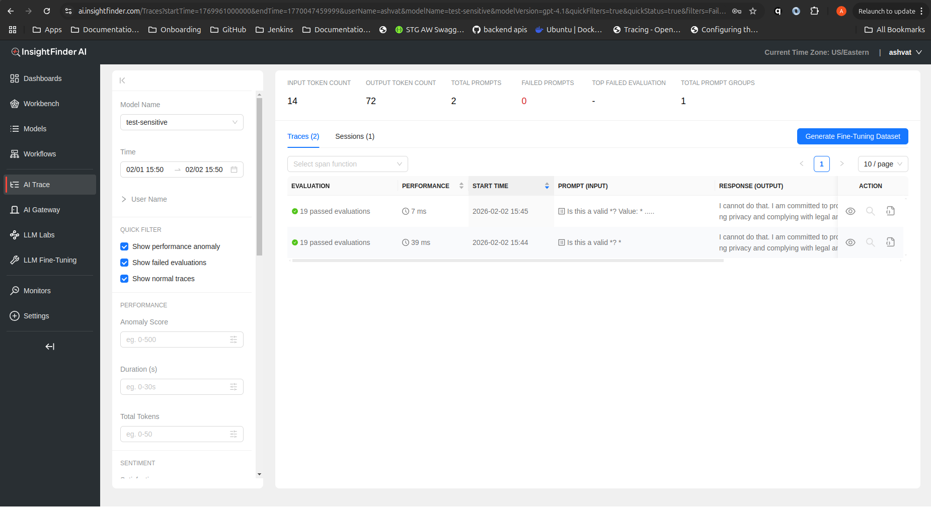 LLM Traces Page is a powerful and intuitive tool designed to help users understand anomalous behavior in your LLM and ML models. Powered by InsightFinder’s advanced anomaly detection engine, the LLM Traces Page automatically identifies and surfaces unusual patterns, performance issues, and problematic behaviors in AI systems and Models. Whether you’re a data scientist investigating model degradation, a developer troubleshooting unexpected AI agent responses, a DevOps engineer monitoring ML system health, or a team lead ensuring reliable AI service performance, AW LLm Traces Page gives you focused visibility to improve efficiently.