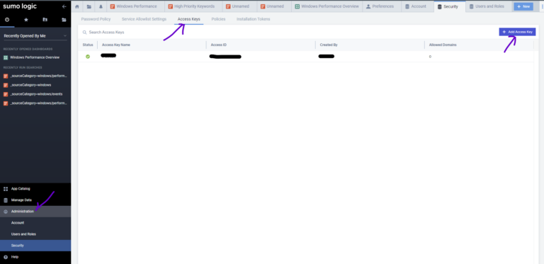 Information needed: Sumo Logic account access key for authentication. To get it, you need to login to a sumologic account and go to the “Administration” section on the left bottom. Click on “Security” there and you will be presented with the screen where you need to select the “Access key” tab. To generate a new key, click on “Add Access key” on the top right.