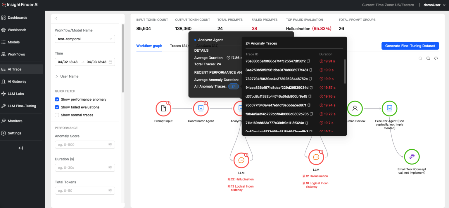 Complete lifecycle management for teams building and running LLM and ML models. InsightFinder provides an end-to-end AI Observability Platform that helps teams build, deploy, govern, and maintain trustworthy AI systems in production; while controlling cost and improving reliability.