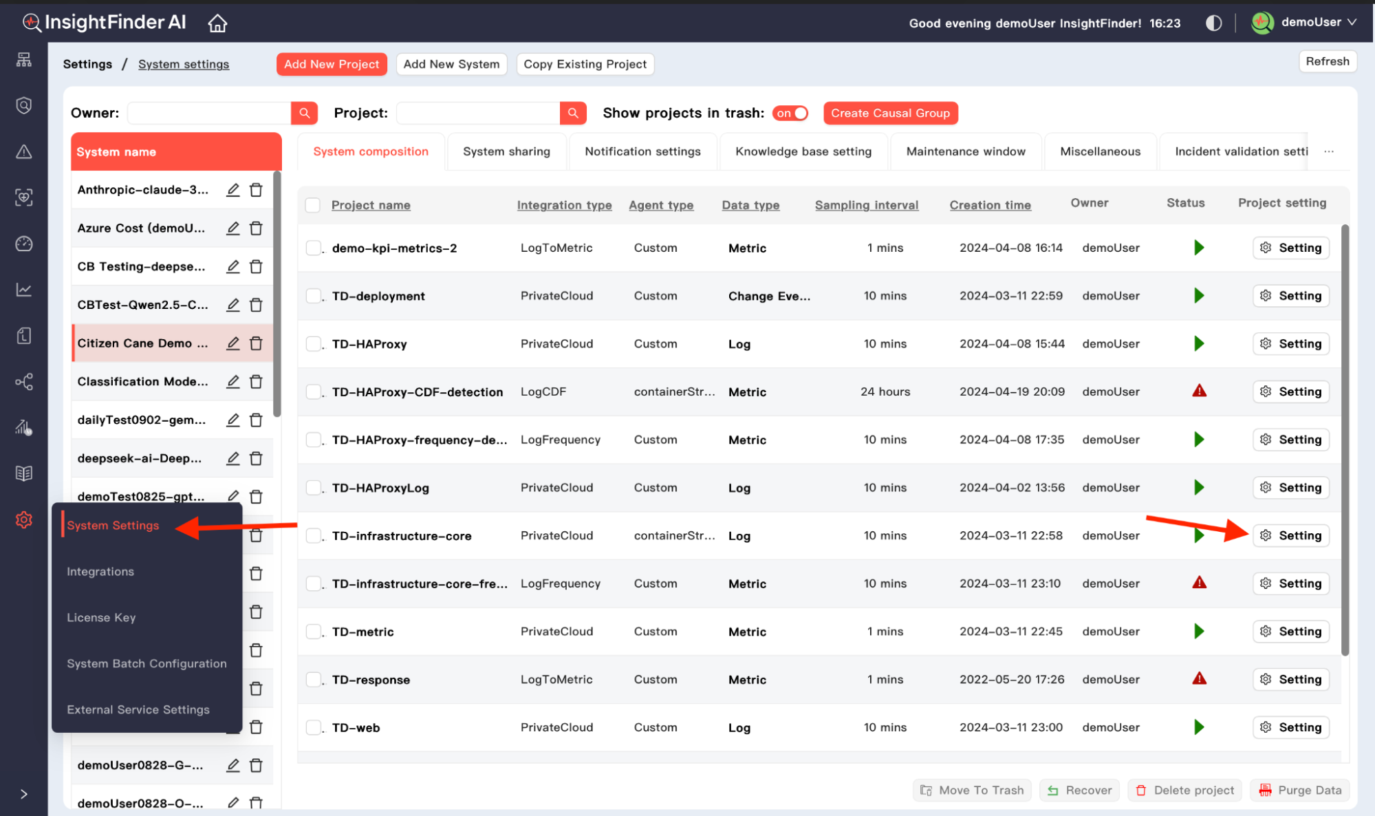 3. Select the appropriate System, then click the gear icon settings next to the Log, Alert or Change Event project you want to configure.