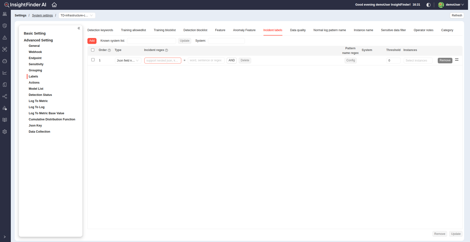 The Incident Labels section allows you to define keywords or regular expressions that are used to identify log entries indicating incidents.