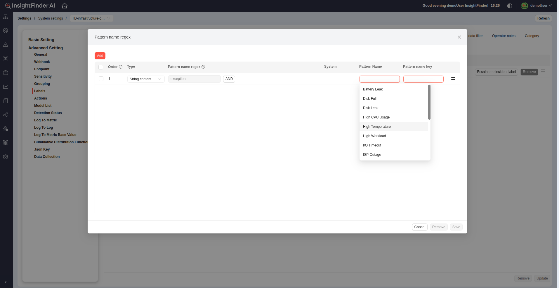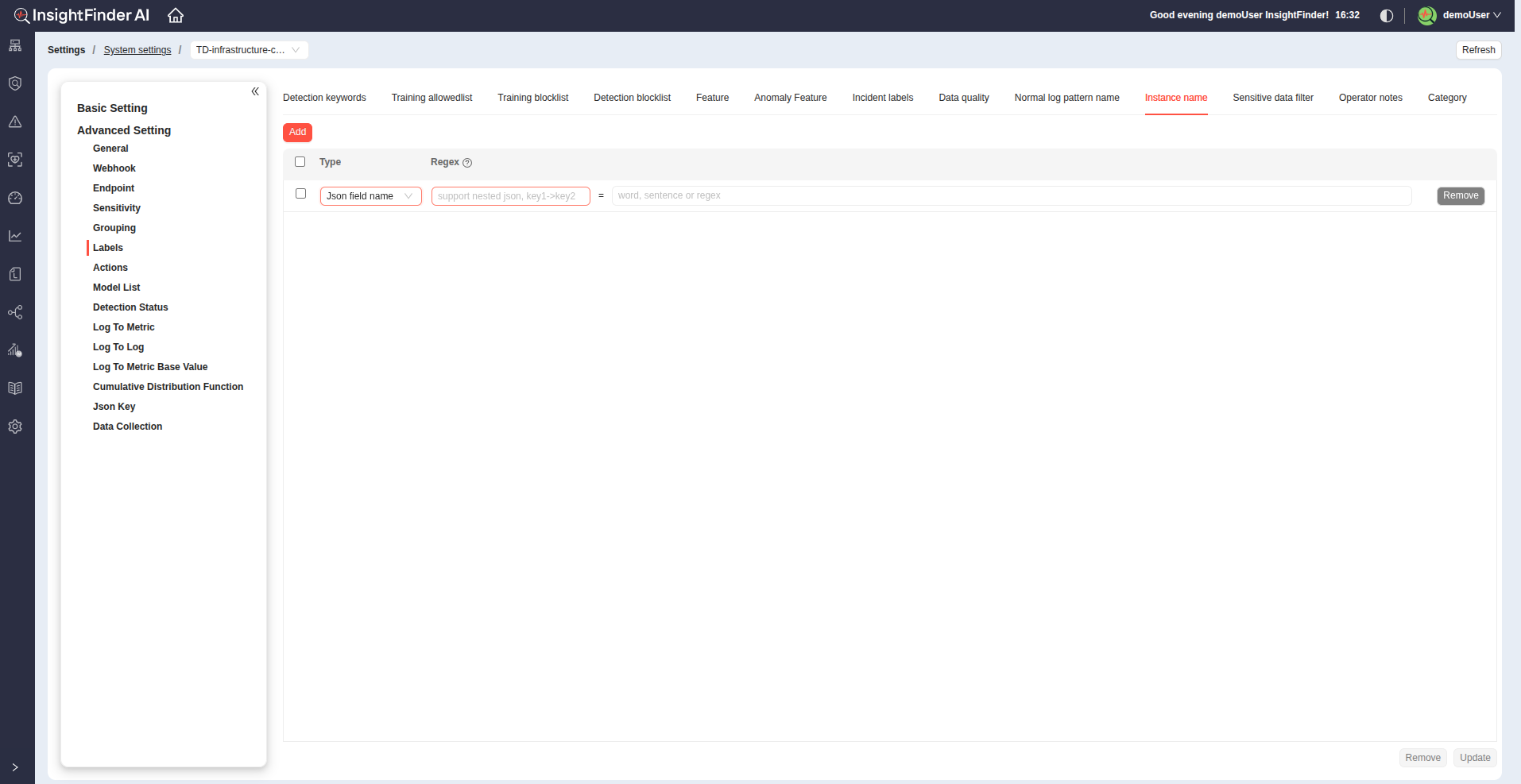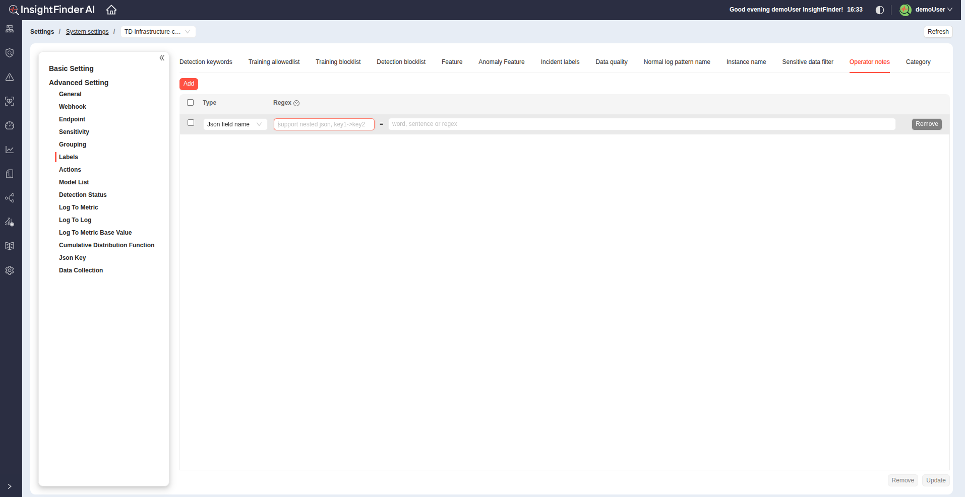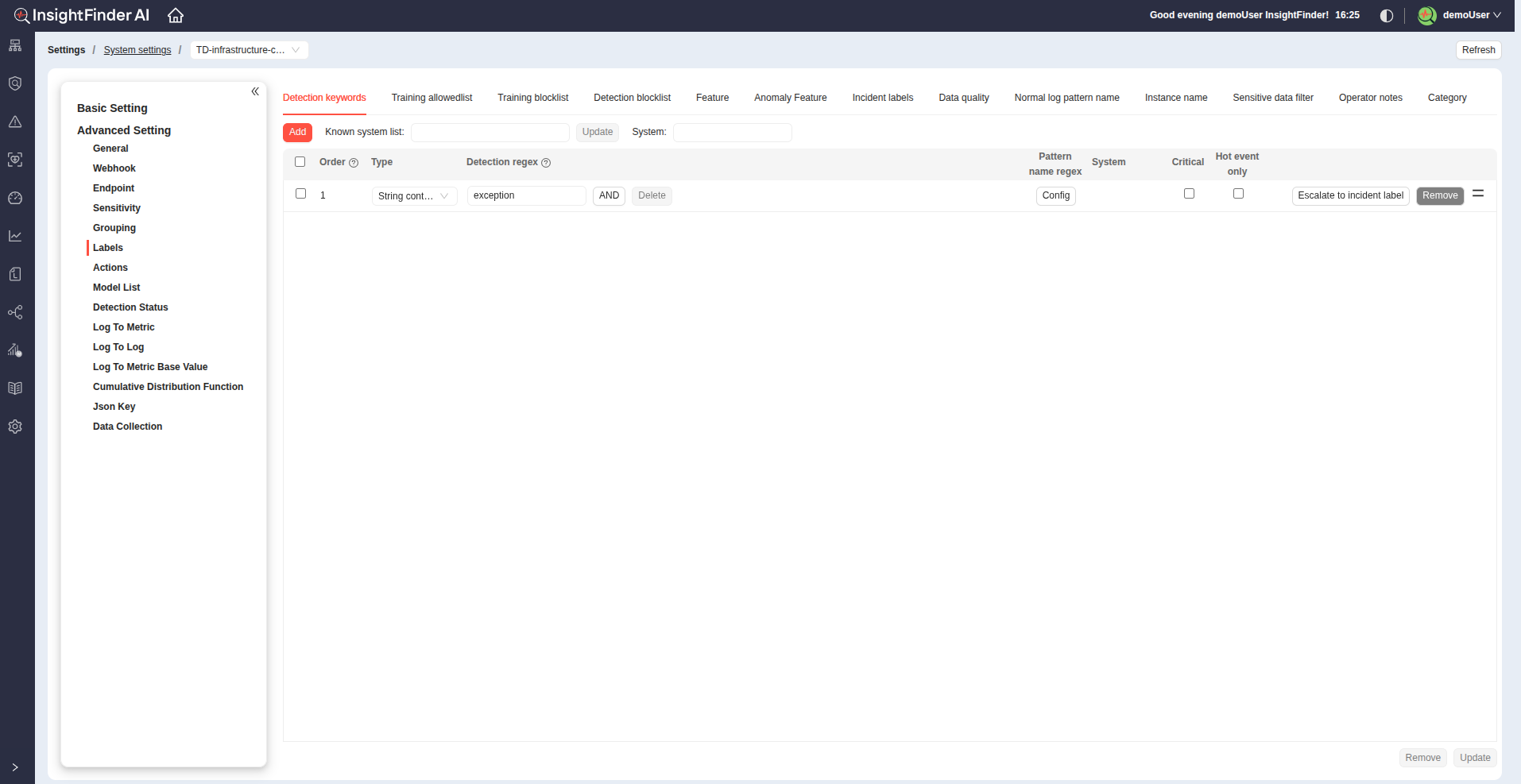 The Label Settings section in InsightFinder UIE allows you to define, organize, and fine-tune how log data is classified, filtered, and interpreted within a project.These configurations help the system automatically detect patterns, extract meaningful fields, and associate logs with key operational categories such as incidents, anomalies, data quality issues, and more.