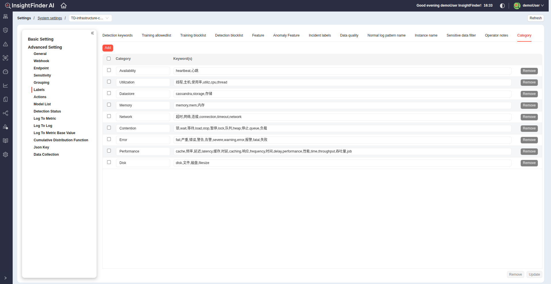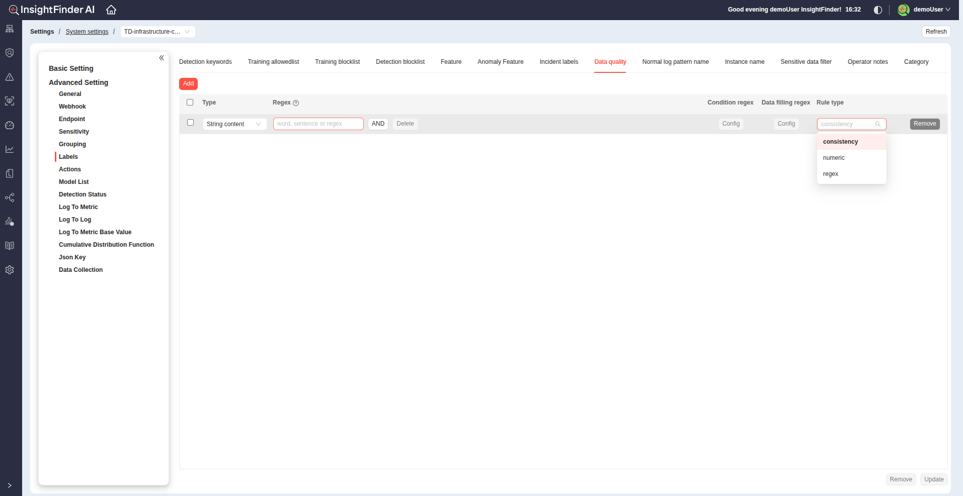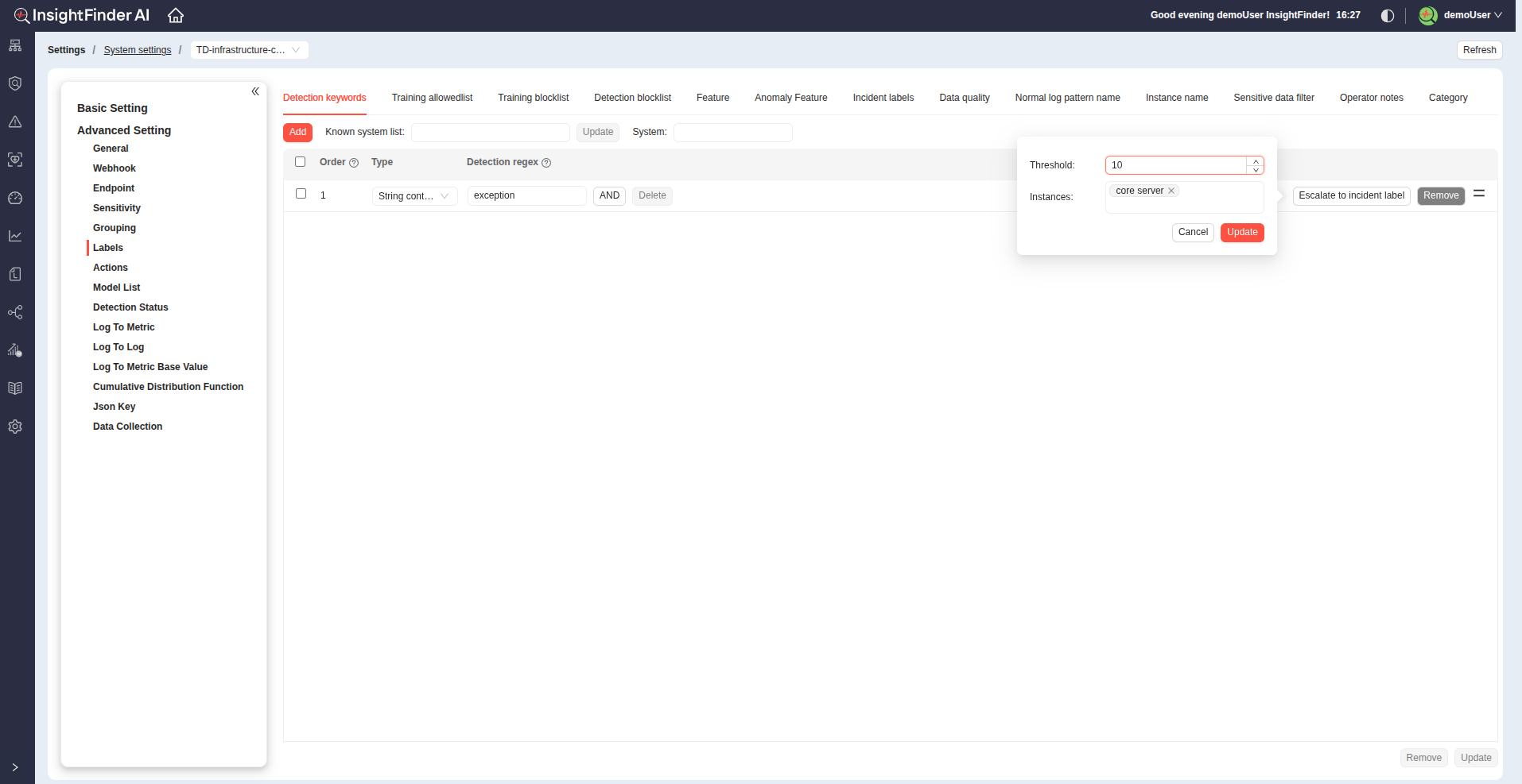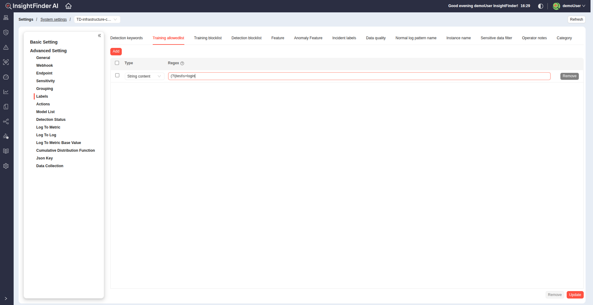 The Label Settings section in InsightFinder UIE allows you to define, organize, and fine-tune how log data is classified, filtered, and interpreted within a project.These configurations help the system automatically detect patterns, extract meaningful fields, and associate logs with key operational categories such as incidents, anomalies, data quality issues, and more.