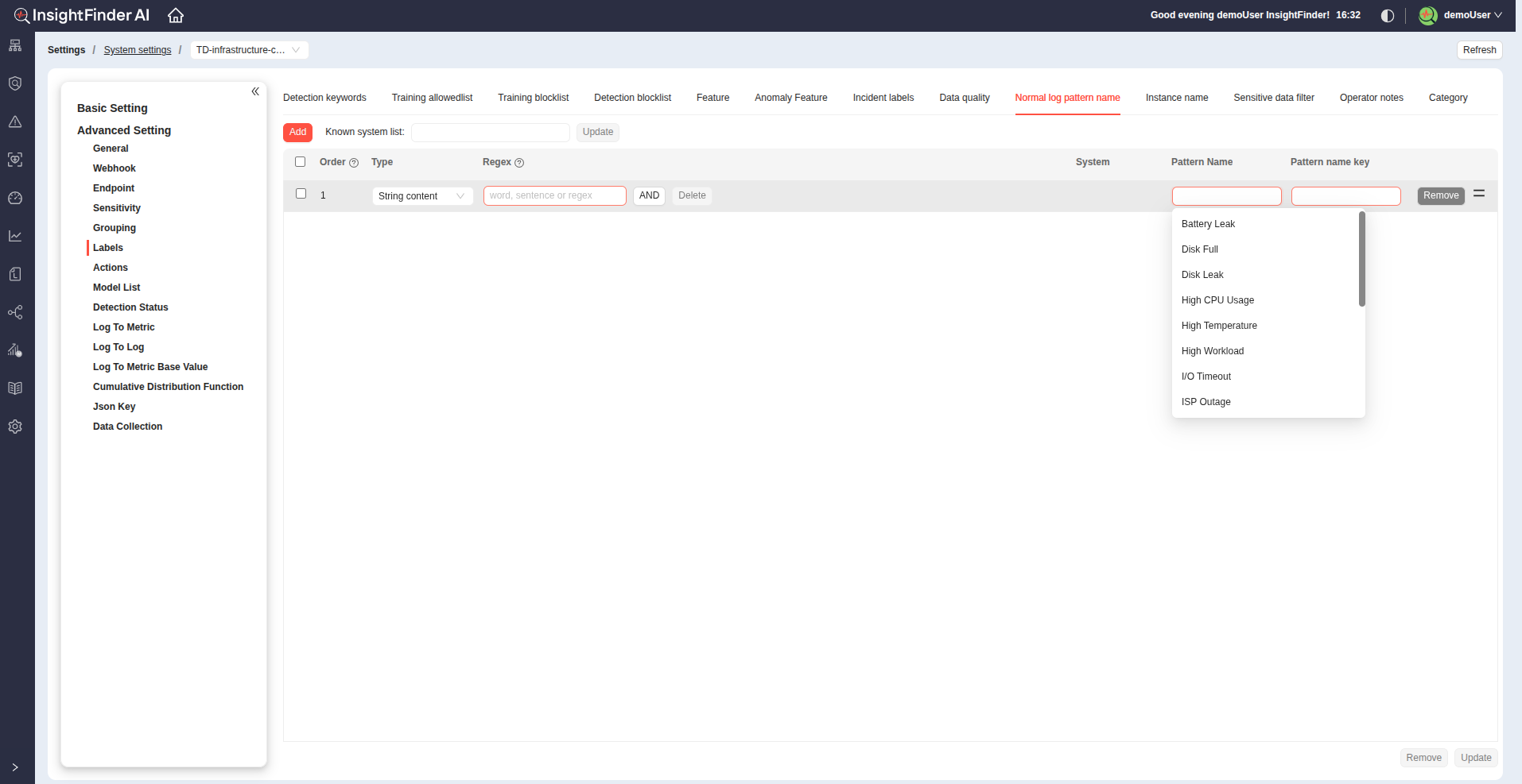 The Normal Log Pattern Name section allows you to define keywords or regular expressions that are used to identify and name common log patterns.