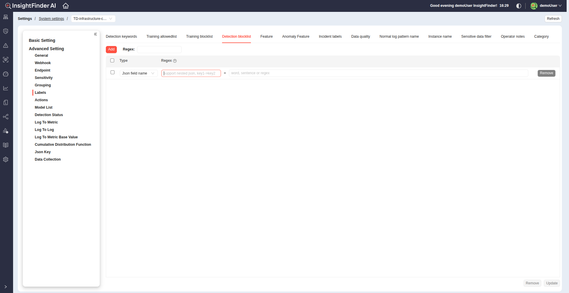 The Detection Blocklist specifies keywords or regular expressions for log entries that should be excluded from alert detection.