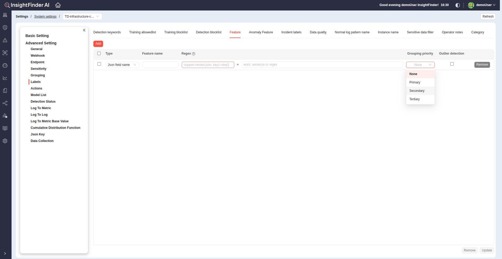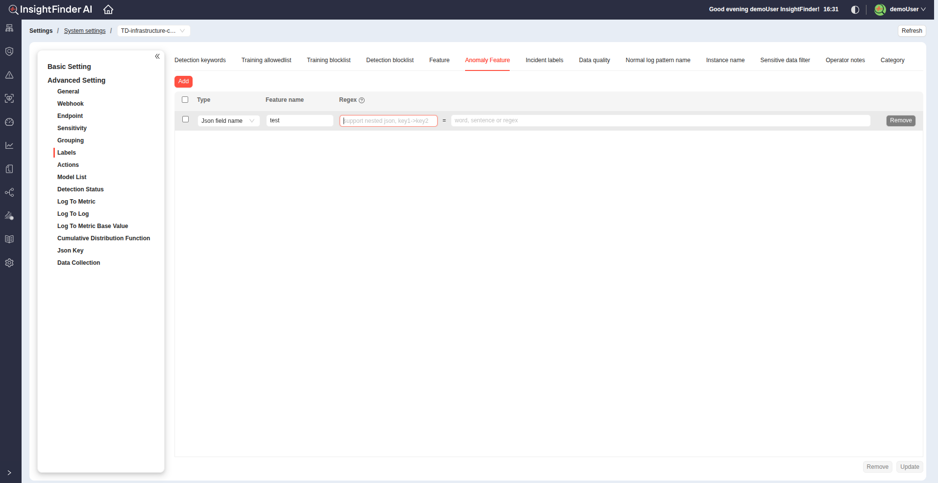 The Anomaly Feature section allows you to define keywords or regular expressions used to extract key metrics or fields from log data that contribute to anomaly detection.