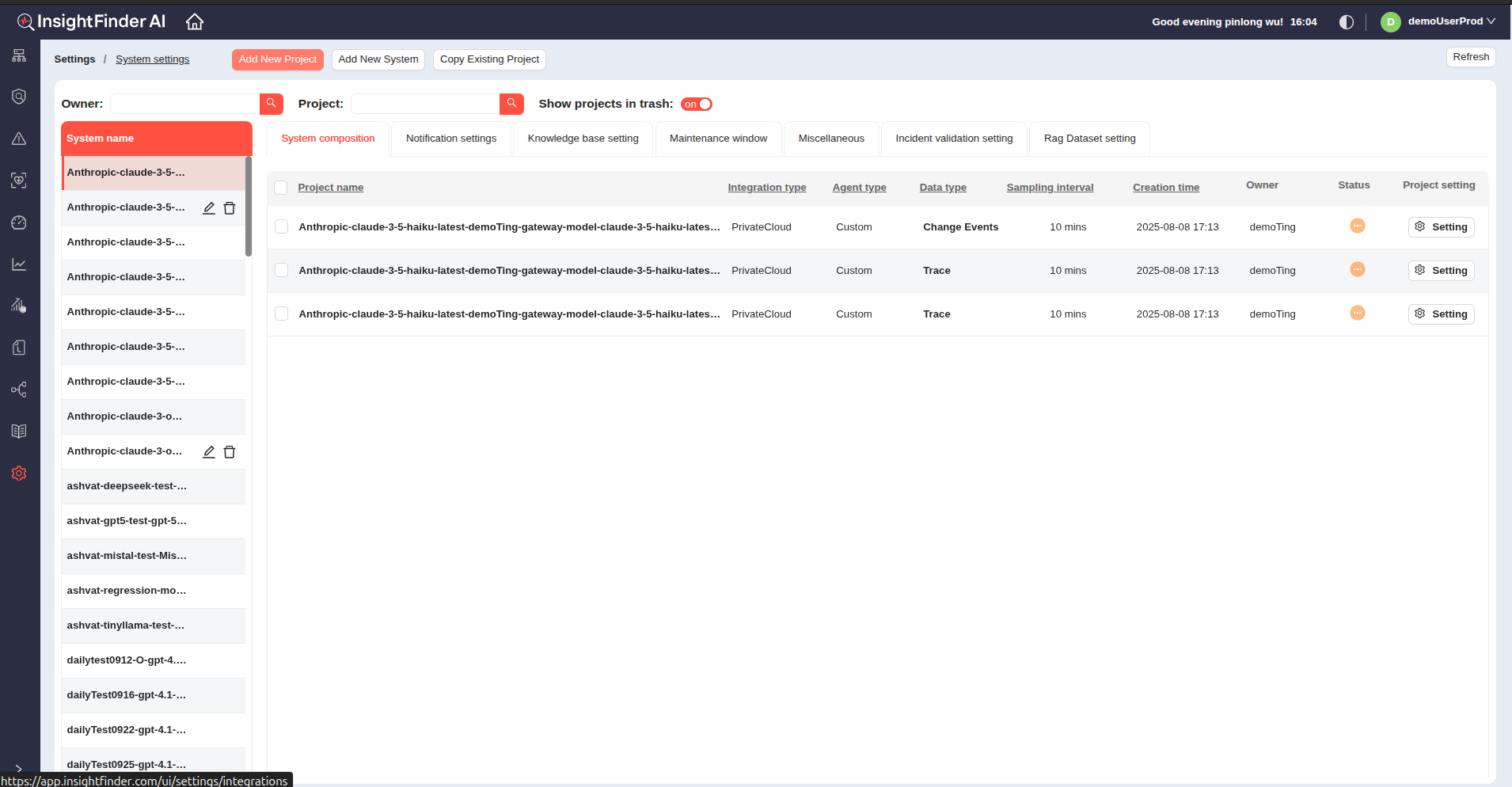Once you’ve created your Project you can start integrating technologies into InsightFinder. For detailed instructions see the Integrations section. If you would like to know more about Projects, review the Projects – Deep Dive section.